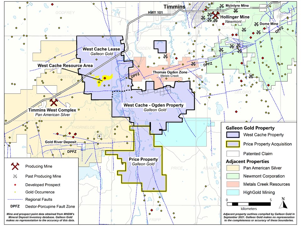 R. David Russell, President and CEO of Galleon Gold commented, “Our success at West Cache has shown the significant potential that exists in the Timmins West Camp; we are very pleased that the owners of the claims adjacent to us have entrusted Galleon Gold with the continued exploration of the newly acquired ground and we welcome them as shareholders.”
