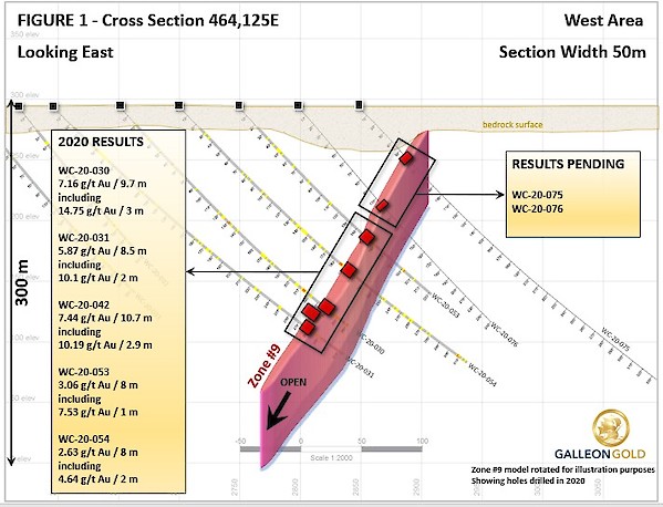 Figure 1 provides an updated cross-sectional view on the Zone #9 mineralized intervals. The Company has traced the mineralized zone up dip from the discovery hole WC-20-30 (9.7 m over 7.16 g/t Au), to the bedrock surface in hole WC-20-75. Assays are pending.