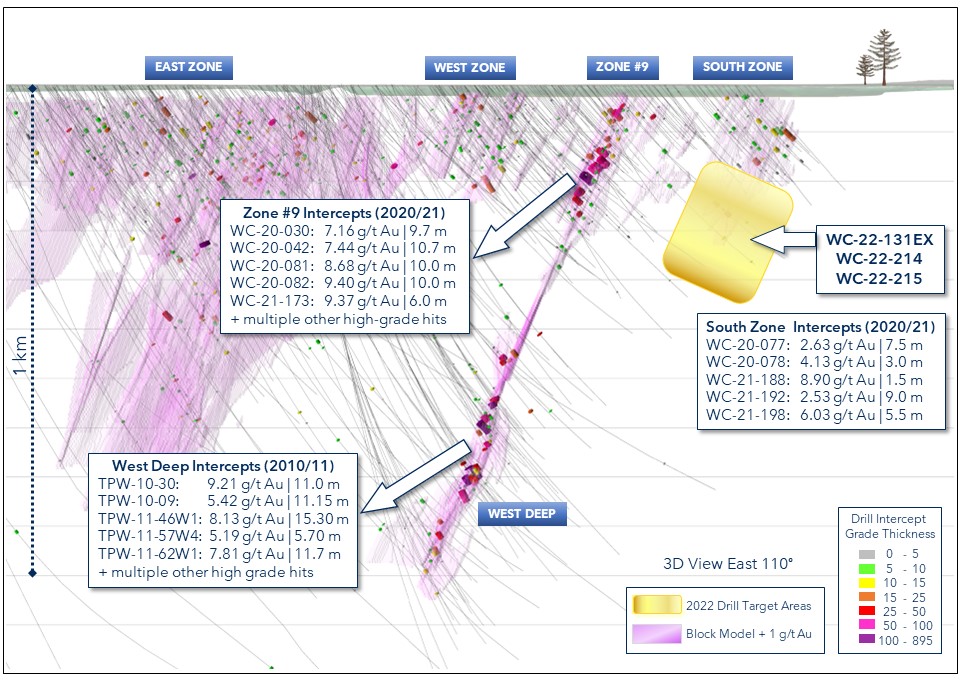 The fourth hole was collared to intersect the South Area zones within a gap between near-surface (2.53 g/t Au | 9.0 m, including 7.96 g/t Au | 2.03 m in WC-21-192) and deeper intercepts (2.63 g/t | 7.5 m, including 6.95 g/t Au | 2.0 m in WC-20-077) drilled during the 2020-2021 program. The objective of the ongoing 2022 South Area drilling is to determine potential shoot geometry within the 300-meter strike length of the drill-tested area, which is approximately 350-meters due south of high-grade Zone #9.