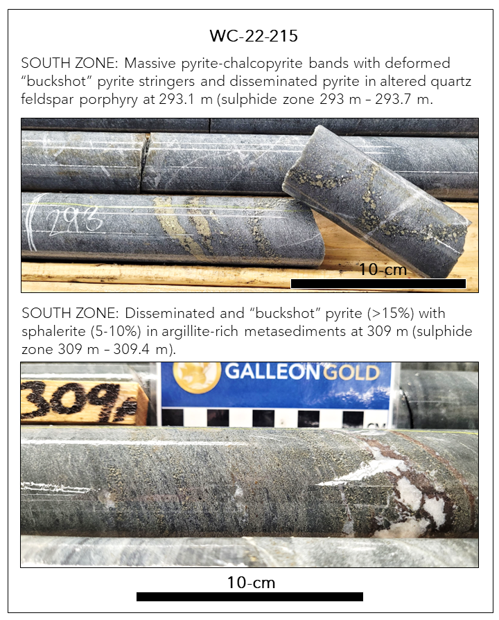 Figure 1 shows the target area of the first four holes in relation to high-grade Zone #9 which is hosted in the metasediment-dominant stratigraphy. The cross section in Figure 2 identifies the sulphide zones in hole WC-22-215, while Figure 3 provides photographs of the core that has been logged and sampled.