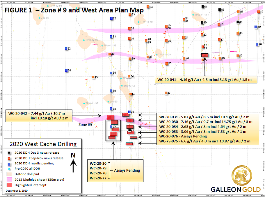 TORONTO: December 03, 2020. Galleon Gold Corp. (TSXV: GGO) (the “Company” or “Galleon Gold”) is pleased to report it continues to intersect significant gold grades in all three target areas at its 100% - owned West Cache Gold Project, Timmins, Ontario.