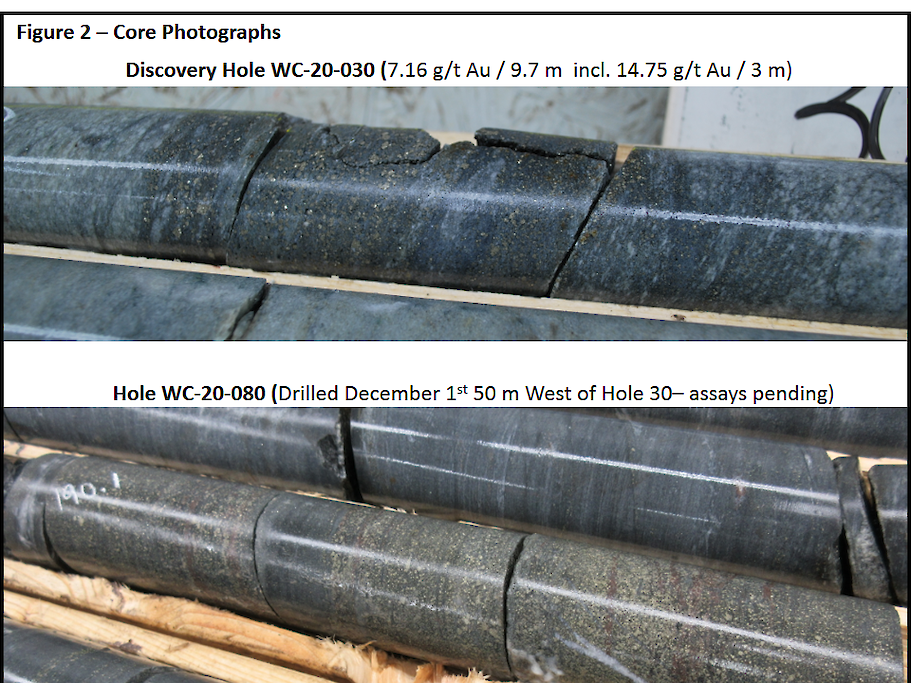 - WC-20-075 intersected 6.6 g/t Au over 4.0 m, from 54 to 58 m including sub-interval of 10.87 g/t Au over 2.0 m; near surface intercept of Zone-9.