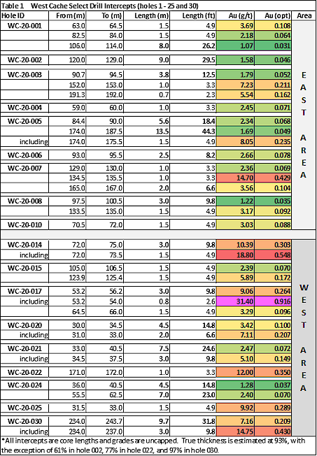 The Phase 1 infill drill program, as outlined in the Company’s press release dated June 29, 2020, is designed to provide better definition and confirm geological continuity of mineralized gold zones in contemplated open pit and underground areas. These areas were previously identified during the West Cache resource study (2013 Technical Report) and are currently referred to as the East and West Areas. A second drill phase beginning with hole WC-20-032 is ongoing and is designed to infill slightly deeper gold mineralization in both areas as the project moves towards the updated gold resource and Preliminary Economic Assessment (PEA) report. Initial 2020 drill data compilation and study suggests that the East Area has nearly twice the number and volume of mineralized shears defined by intervals exceeding 0.50 g/t Au relative to the West Area, although average grades appear to be significantly higher in the West Area. This difference may be a function of host rock composition, but more study is needed.