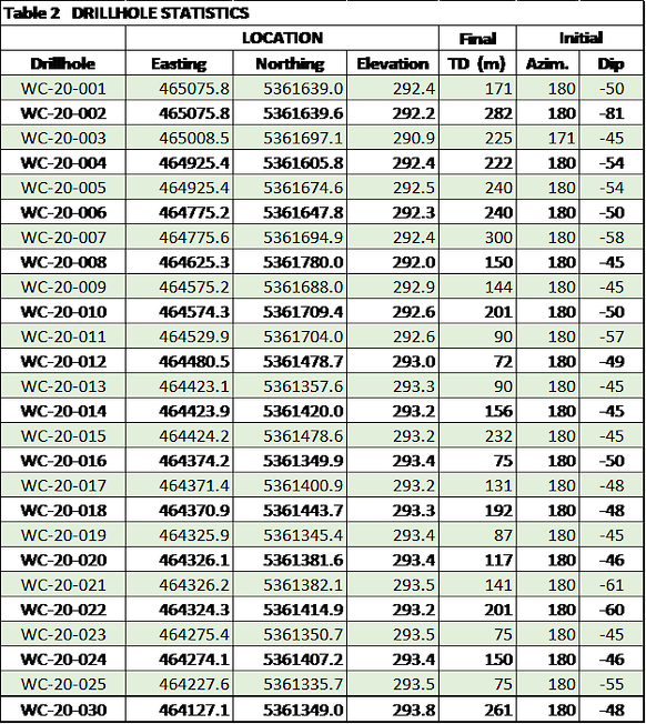 - East Area Phase 1: completion of 11 holes (WC-20-001 to WC-20-011) totaling 2,265 m provide infill open pit definition and will support an update to the resource as part of the planned PEA. Assay results are shown in Table 1 below, while drillhole locations and other statistics are tabulated in Table 2.