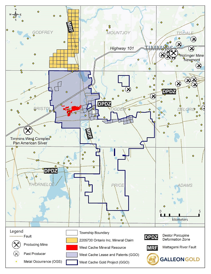 Toronto, Ontario, March 12, 2025 – Galleon Gold Corp. (the “Company” or “Galleon Gold”) (TSX-V: GGO) (FSE:3H90) is pleased to announce it has entered into an agreement (the “Agreement”) to acquire 66 mineral claims totaling 1,409 hectares (the “Mineral Claims”) in Godfrey and Bristol Townships that are contiguous to the Company’s West Cache Gold Project in Timmins, Ontario.