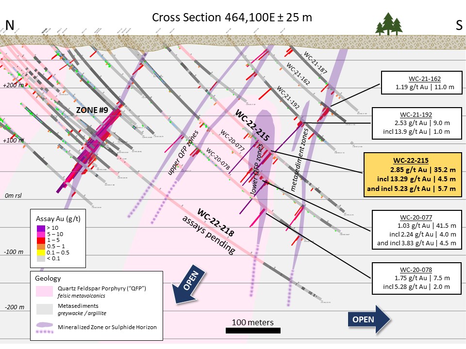 Hole WC-22-215 was collared to intersect South Area mineralized zones within a gap between near-surface (2.53 g/t Au | 9.0 m, including 7.96 g/t Au | 2.03 m in WC-21-192) and deeper intercepts (2.63 g/t | 7.5 m, including 6.95 g/t Au | 2.0 m in WC-20-077) drilled during the 2020-2021 program. Figure 1 provides a cross sectional view of the intercepts, where drilling continues to define higher zones within a broad mineralized envelope of gold mineralization. Some of these better grades and widths are within fine grained to locally porphyritic felsic metavolcanics, where the more cohesive “hole 215 footwall zone” remains 12 to 15 meters from a major contact with interbedded coarse to very fine-grained metasediments. Importantly, the higher grade 215 footwall shoot is located only 300-meters south of high-grade Zone #9.