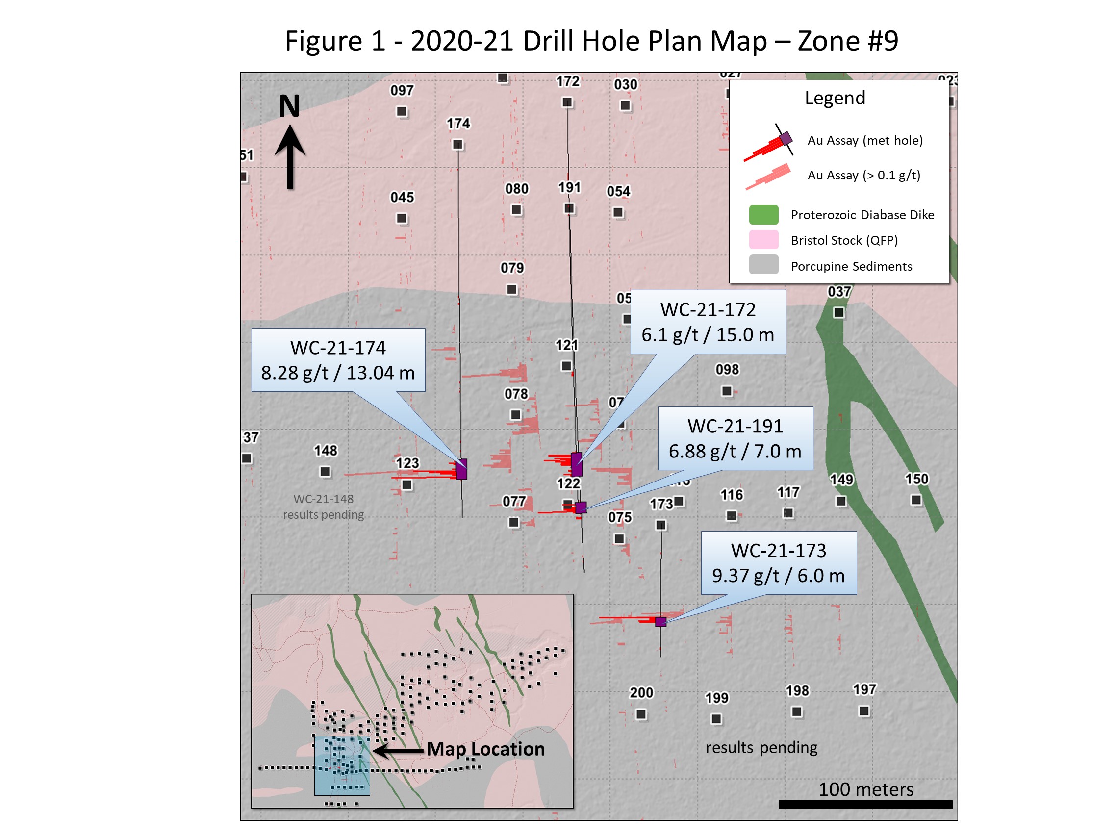 - WC-21-173 at 9.37 g/t Au over 6.0 m (63.6 to 69.6 m) including 13.19 g/t Au over 4.0 m (63.6 to 67.6 m); true thickness of estimated at 94%