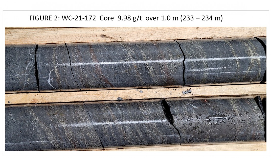 - WC-21-174 at 8.28 g/t Au over 13.04 m (211 to 224.04 m) including 14.58 g/t Au over 6.04 m (218 to 224.04 m); true thickness estimated at 98%