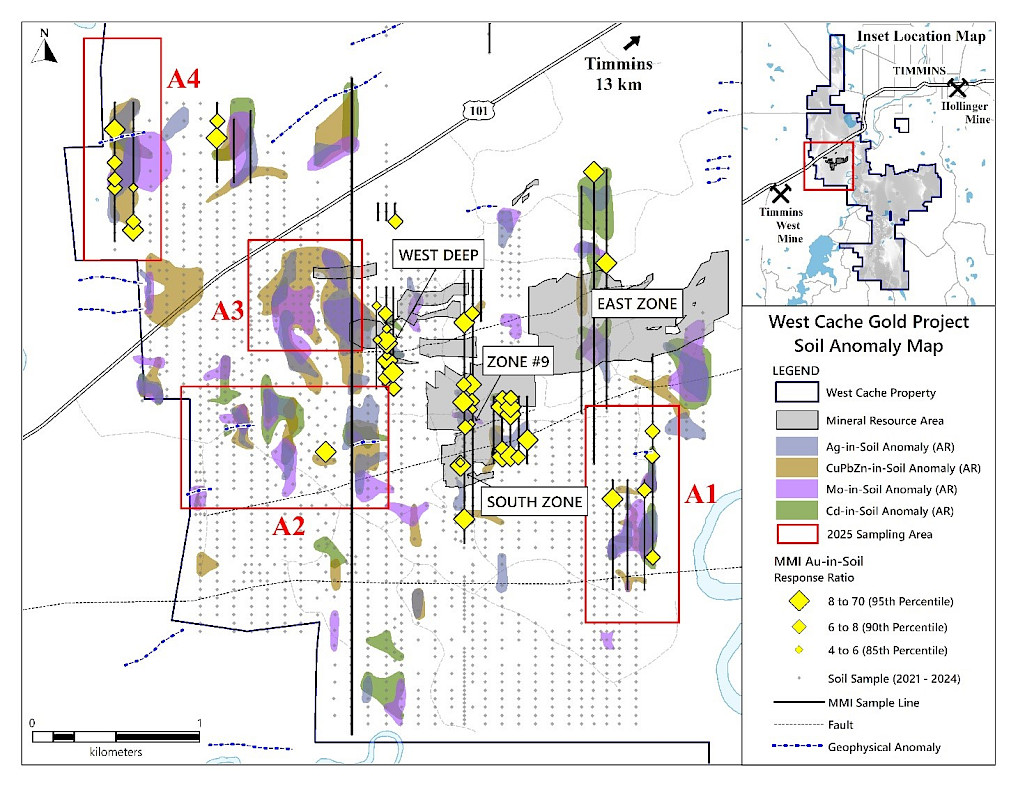 The Company completed an MMITM orientation soil sampling program over three known gold zones in 2021 to determine elemental responses over different styles and depths of known mineralization at West Cache. Over subsequent programs outside of the Mineral Resource Area, geochemical sampling grids covering the regional geological trend were sampled to better understand soil types encountered on the property, B-horizon depth and possible locations for till sampling. All samples were analyzed by Aqua Regia (“AR”) digestion with a subset of samples undergoing MMITM analysis. Figure 1 summarizes the results of the previous soil programs and identifies the main areas (A1-A4) that will be the focus of the 2025 soil sampling program. The anomalies in Figure 1 were interpreted by plotting response ratios generally greater than the 90th percentile and considered proximal samples above the 80th percentile response.