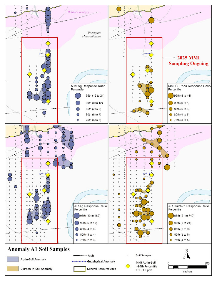 Anomaly A1 was identified approximately 1.5 kilometers to the southeast of Zone #9 (a high-grade gold zone that is the focus of the current bulk sample program). In 2024, reconnaissance Aqua Regia samples returned anomalous copper and silver values in sandy B-horizon soil that generally responded with nil to low values in sand elsewhere on the property. MMITM follow-up returned response ratios up to 50X background for gold (2.5 ppb) and up to 42X for zinc, which are comparable to responses seen over Zone #9. Twelve out of forty-seven samples yielded MMITM response ratios above 10X background for silver and zinc. Figure 2 compares combined Cu+Pb+Zn and Ag responses for both Aqua Regia and MMITM analyses at Anomaly A1 and outlines the 2025 sampling area.