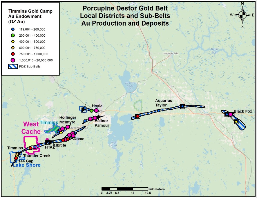 The West Cache Gold Project is located 13 km west of Timmins Ontario and is serviced by Provincial highway 101 and secondary access roads. The central portion of the project area is situated along the Porcupine-Destor gold belt, approximately 7 km northeast of Pan American Silver’s Timmins West Mine and 14 km southwest of Newmont’s Hollinger Mine.