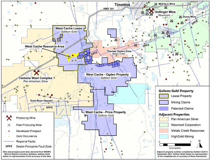 The West Cache Gold Project is located 13 km west of Timmins Ontario and is serviced by Provincial Highway 101 and secondary access roads. It is situated in the Western Porcupine Gold Camp along the Destor-Porcupine Fault Zone (“DPFZ”) within the Abitibi greenstone belt, approximately 7 km northeast of Pan American Silver’s Timmins West Mine and 14 km southwest of Newmont’s Hollinger Mine.