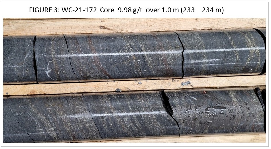- WC-21-172 intersected 6.1 g/t Au over 15.0 m (230 to 245 m) including 9.89 g/t Au over 7.0 m (231 to 238 m); true thickness of these intervals is estimated at 98% of the reported intercept length