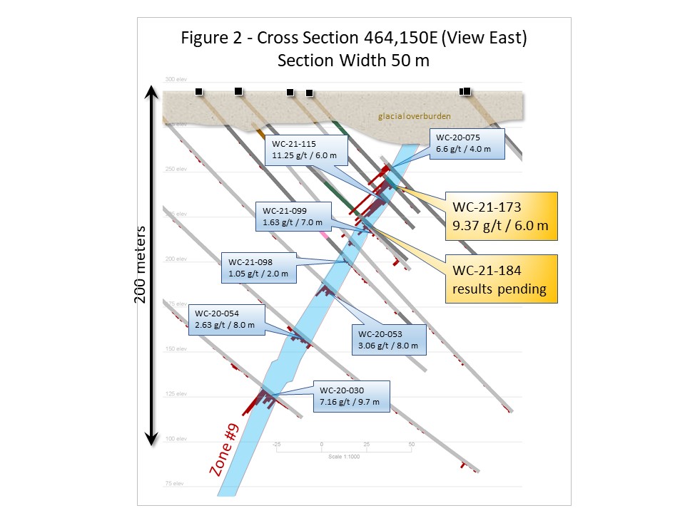 Hole WC-21-173 is located mid-way between previously announced holes WC-21-115 (11.25 g/t Au over 4.0 m) and WC-20-75 (6.6 g/t Au over 4.0 m) - see press releases dated December 3, 2020 and February 16, 2021. This intercept at 50 m below surface provides further confirmation that Zone #9 contains high grade mineralization just below the bedrock interface.