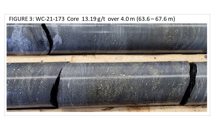 - WC-21-173 intersected 9.37 g/t Au over 6.0 m (63.6 to 69.6 m) including 13.19 g/t Au over 4.0 m (63.6 to 67.6 m); true thickness of these intervals is estimated at 94% of the reported intercept length