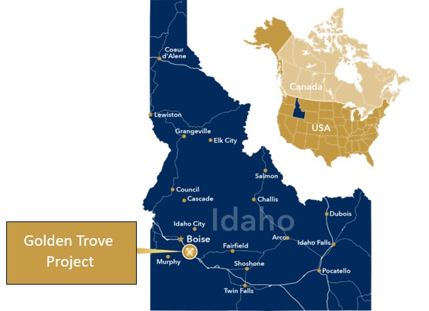 The Golden Trove Project is located near Boise, Idaho and has excellent access via 20 kilometers of improved gravel and dirt roads from Interstate-84. A 25-minute commute from Boise provides easy access to the many private and government services available in Idaho’s largest city. The rolling hills in the area are part of the Danskin Mountain Range, but are arid and mostly covered by sage and scrub-brush. Although one small underground gold mining operation is located approximately 4 miles on strike to the southwest from the property, most of the industry in the immediate area is ranching related. Golden Trove private property consists of 5 patented mining claims covering approximately 22.4 hectares (55.38 acres) and another 7 unpatented lode claims covering about 52.6 hectares (130 acres) located on Forest Service administered public lands.