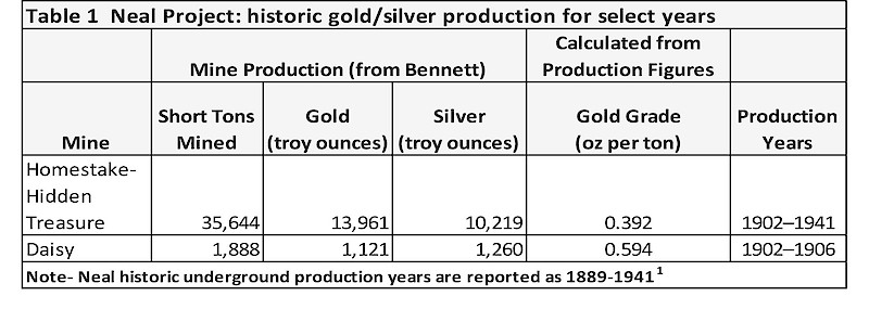 The project site was the most productive gold producer in the Neal Mining District, with underground production from 1889 through 1941 sourced mainly from the Hidden Treasure, Homestake and Daisy Mines. According to US Bureau of Mines records, the Neal Mining District is estimated to have reported production of at least 30,000 ounces of gold, with most of this coming from the Golden Trove Property (formerly called Neal Project). Table 1 provides a summary for a select range of historic underground production years for which data is available.