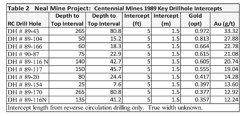 In the 1989-1990 time period, Centennial Mining completed a reverse circulation drill program targeting near surface oxide gold mineralization that consisted of 190 vertical and 18 angle holes totaling 47,655 ft (14,525 m). Although this drilling was not the first at Neal, it was the first extensive program intended to define a resource for a contemplated open pit heap leach gold operation. The program was generally successful in identifying five vein zones and accessing near surface oxide potential.