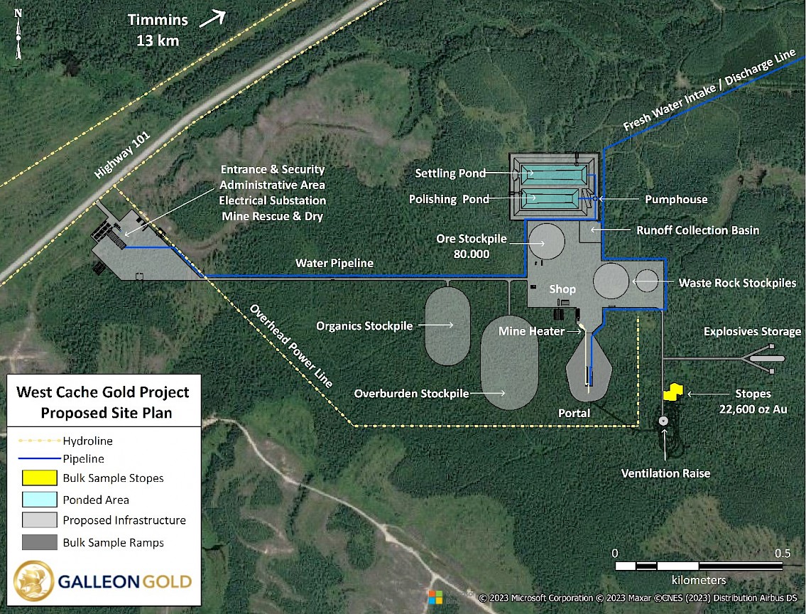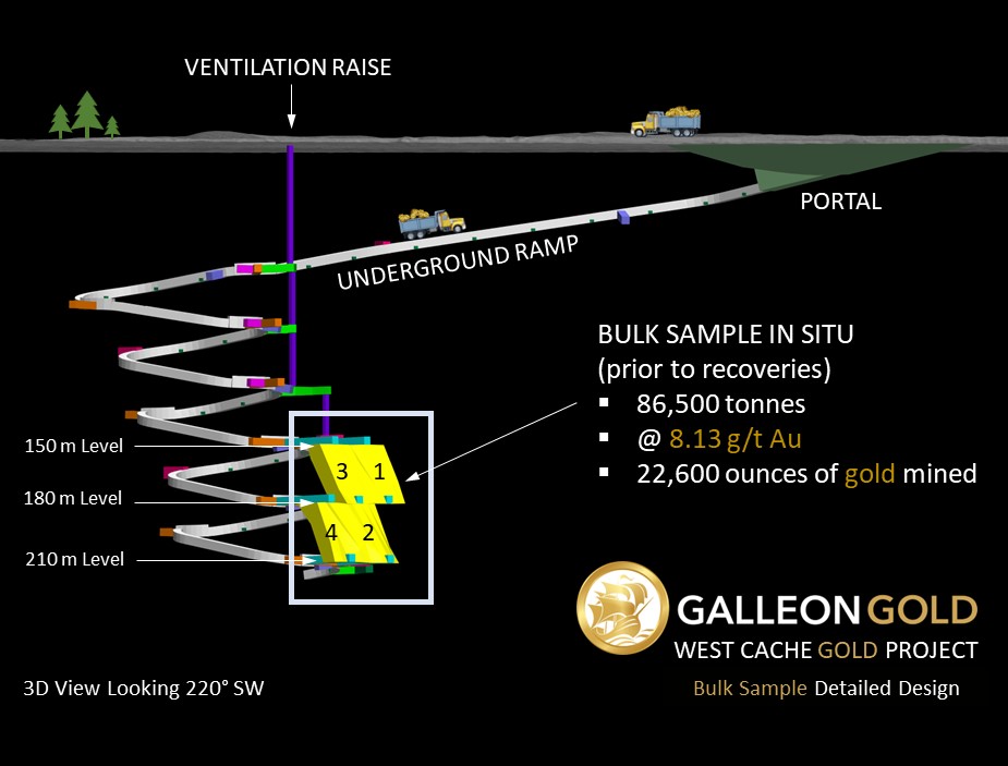 David Russell, President and CEO of Galleon Gold commented, “Transitioning West Cache from exploration to advanced stage exploration is a critical milestone for Galleon Gold. Once we receive the final acceptance of our Closure Plan and other necessary permits, we can start to de-risk the Project with our 86,500 tonne test mining program. The production and processing information gained from the bulk sample, along with underground drilling to delineate additional gold targets, will roll into pre-feasibility work in preparation for full-scale mining operations at the West Cache Gold Project.”