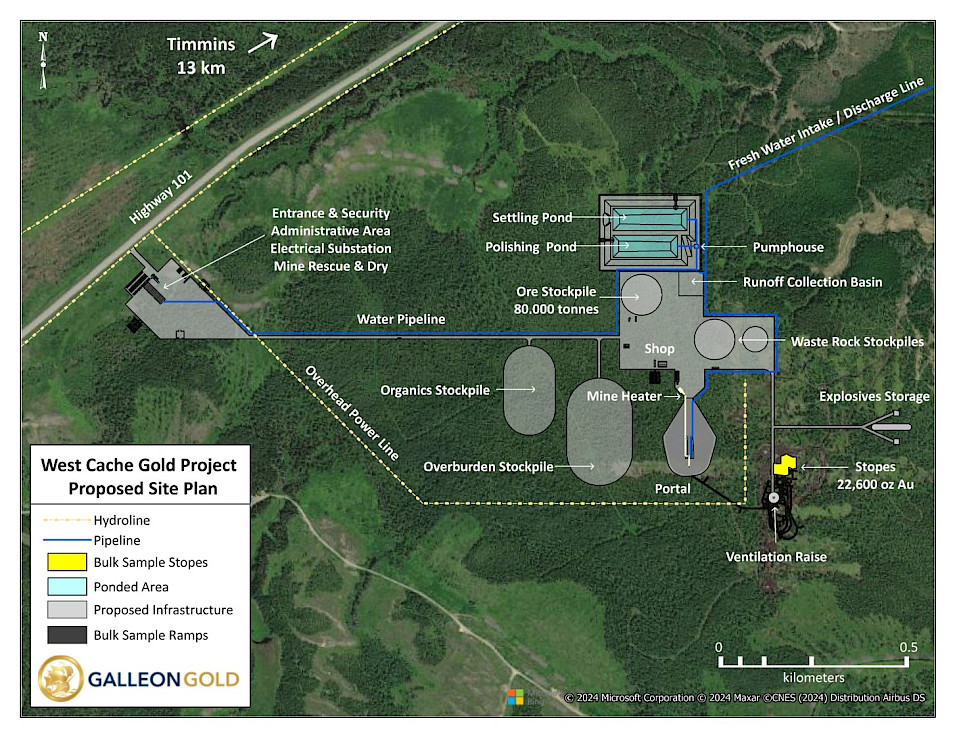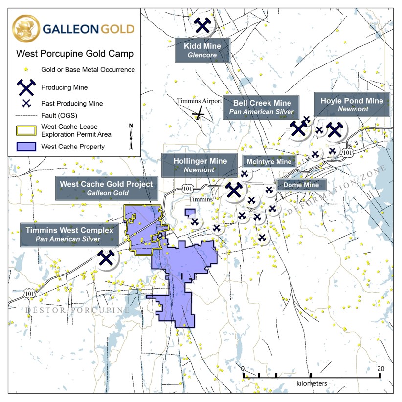 Toronto, Ontario, February 10, 2025 – Galleon Gold Corp. (the “Company” or “Galleon Gold”) (TSX-V: GGO) (FSE:3H90) is pleased to announce it has been issued a letter from the Ministry of Mines (“MINES”) inviting the Company to submit its Closure Plan for a Bulk Sample on its 100% owned West Cache Gold Project in Timmins, Ontario (the “Project” or “West Cache). The Closure Plan is a comprehensive document including a complete project description, construction and mining plans, baseline characterization studies, rehabilitation and reclamation plans, and site monitoring programs to be implemented throughout advanced exploration activities and after closure.